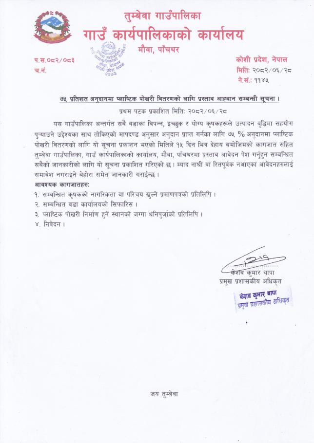 » ७५ प्रतिशत अनुदानमा प्लाष्टिक पाेखरी वितरणको लागि प्रस्ताव आह्वान सम्बन्धी सूचना ।