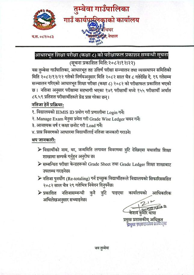 आधारभूत शिक्षा परीक्षा कक्षा ८ काे परीक्षाफल प्रकाशन सम्बन्धी सूचना ।