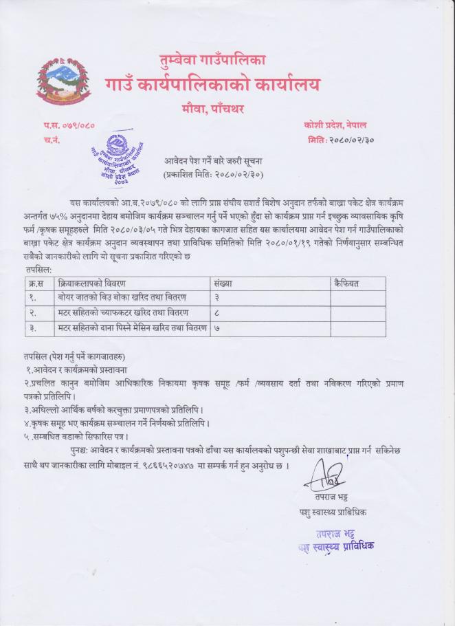 ७५ प्रतिशत अनुदानमा प्लाष्टिक पाेखरी वितरणको लागि दोस्रो पटक प्रस्ताव आह्वान सम्बन्धी सूचना ।