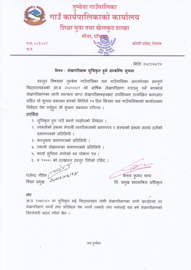 » विद्यालयको लेखा परिक्षण गर्न लेखा परिक्षक सूचिकृत गर्ने सम्बन्धी सूचना ।।
